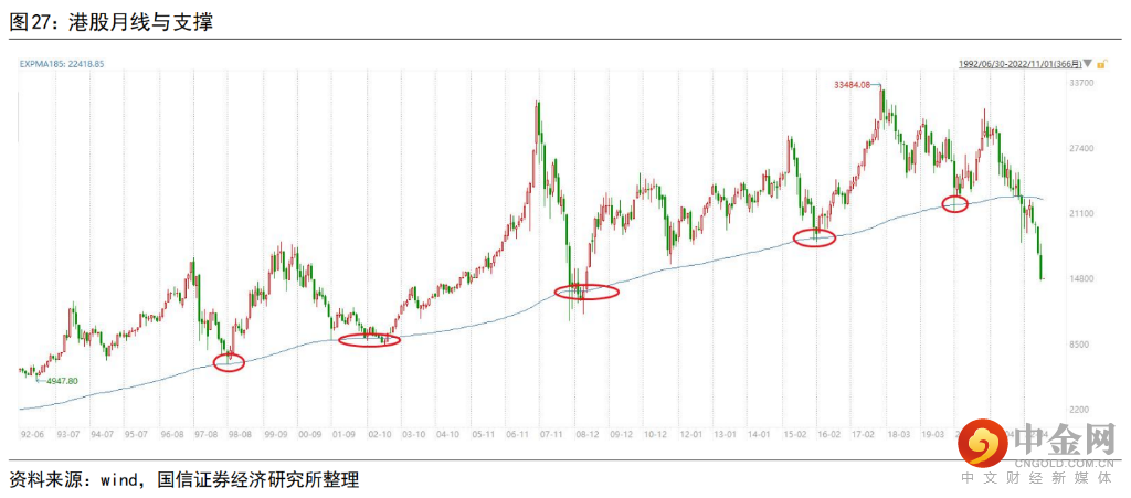 最近国信港股分析师王学恒对港股支撑破坏一文分析,其实也可借鉴:虽然我们看到恒生指数大幅破位(图2红圈),原因是腾讯、美团、阿里巴巴、汇丰这几只指标股就占了指数接近40%的权重,而从2021年来,这几个移动互联的品种跌幅巨大,导致恒生指数看似已入万劫不复之地,但实际绝大部分个股其实也出现了和A股相同的状态,出现了较强的支撑(图3红圈)。而如果预判成真,它将会形成40多年来第5次吸引力超强的大底!