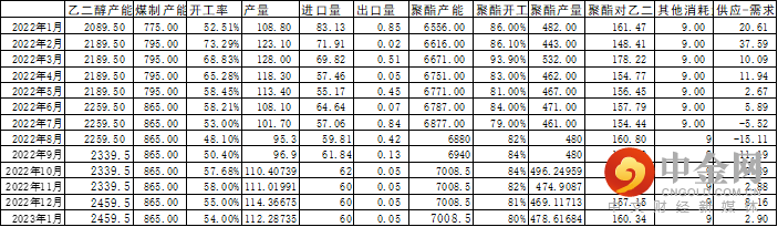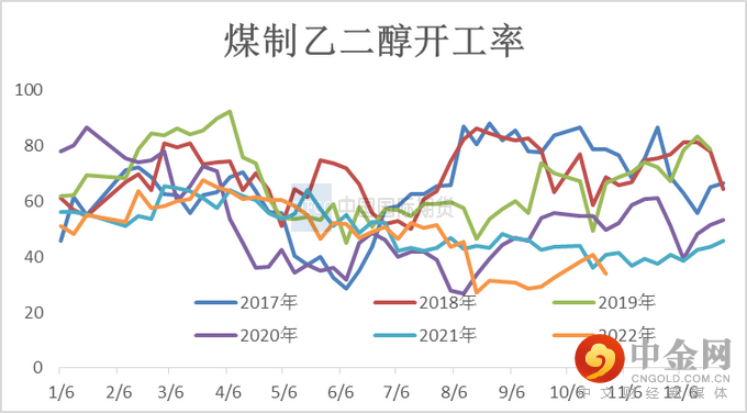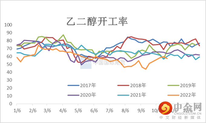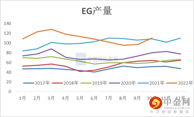 近五年来国内乙二醇产能保持较高增长速度,特别在2021年国内乙二醇产能增速为29.43%。9月份起,中国乙二醇总产能为2339.5万吨,煤制乙二醇总产能为865万吨。国庆假期后,随着渭化、广汇、建元负荷进一步提升,煤制乙二醇装置负荷明显提升。9月下旬起,各地煤炭价格强势上涨,目前仍处于年内高位,而乙二醇价格在节后短暂高开后迅速转弱,煤制企业生产依旧承压,前期效益问题停车装置重启驱动不足。新疆天业共计65万吨装置检修进度暂停,重启待定。如果后期天盈、延长装置调试顺利,负荷将回升至42-43%水平。10月煤制乙二醇开工率为37.98%,较9月提升7.4%。