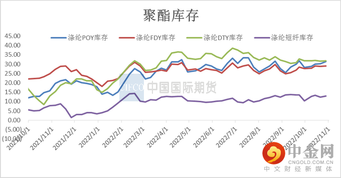 10月下游产品效益走好的同时,终端需求表现依旧疲软,市场买气不足,各产品库存均延续累库。截止10月底POY库存天数31.2天、FDY库存天数29.8天、DTY库存天数32.1天、涤短工厂库存天数12.9天。