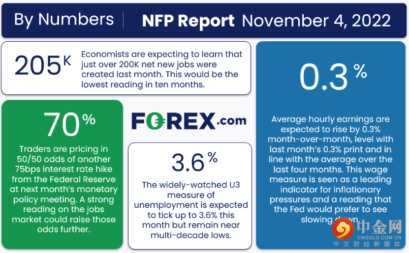 在12月中的议息会议前,非农就业报告还会发布两次,CPI数值也会再更新一次,交易者目前自然无法预期美联储动态。根据芝商所FedWatch工具,五成交易者认为美联储将继续75个基点的加息幅度,而另一半则认为加息幅度会降至50个基点,因此无论本月就业报告数据走势如何,市场波动性都很可能提高。就10月非农就业报告而言,普遍预期认为将新增20.5万净新增岗位,平均小时薪预期环比增加0.3%: