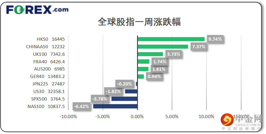 美国三大股指周五集体上扬,但难以改变周线大幅下挫的局面。市场正在权衡加息放缓(短期)以及更高利率峰值(长期)的影响。欧洲股市上周普涨。