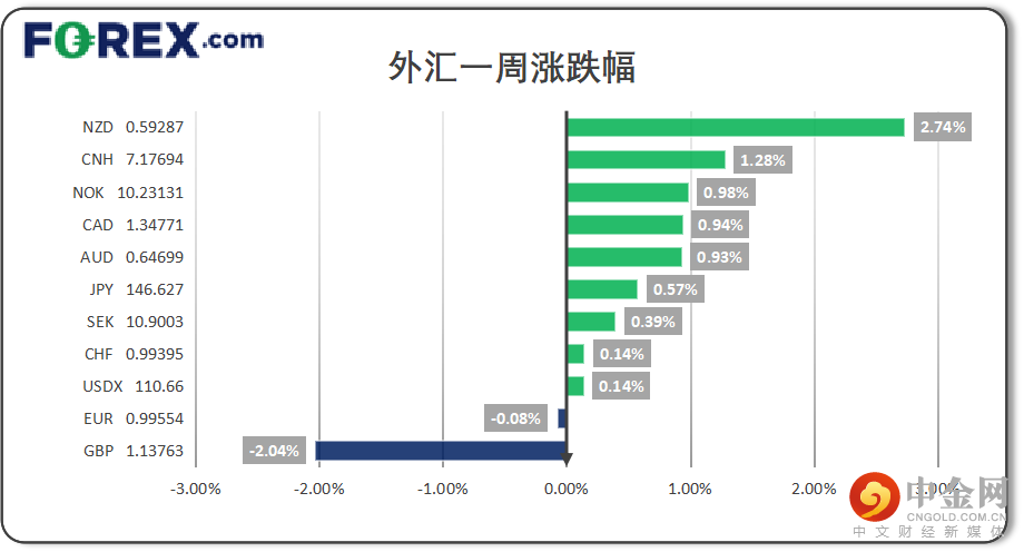 美元指数周五重挫近2%,美债的短端收益率回落,但10年期收益率稳定在4.10%上方。英国央行鸽派加息并表示未来两年经济持续衰退,英镑一周累计下跌超2%。纽元上涨2.74%领涨G10,商品货币全线反弹。
