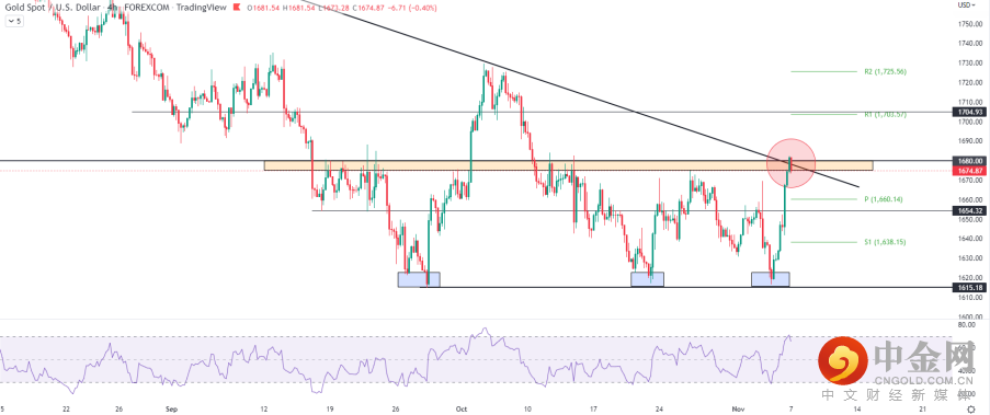 黄金在日线以下级别周期中已经显露出持续性反弹的迹象,三次的底部确认叠加美元上涨势头放缓给多头带来了一定的希望。但在金价真正完成突破之前,需要面对1680附近的阻力区域、下降通道上轨、以及RSI超买的多重考验。