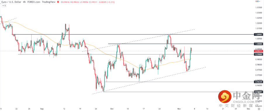 4小时图上关注欧元在通道内部的震荡行情。多头的首要目标为平价水平,其次是前高1.01附近。反之则关注0.9870-0.9900一带的初步支撑。若美元重新走强将压低欧元至通道下沿。