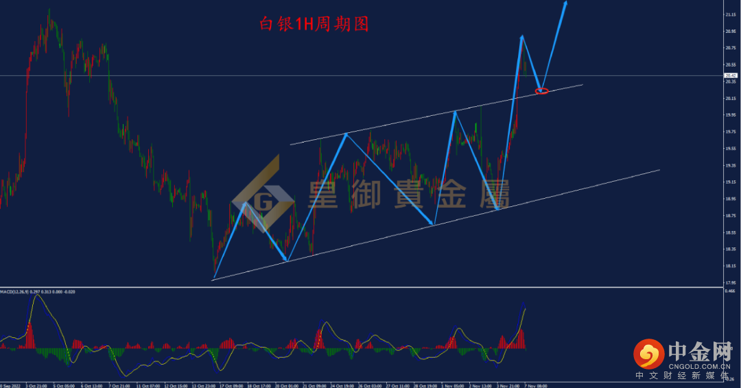 白银1小时周期,白银自跌至18.07附近遇阻后,价格出现企稳并震荡上行。从走势结构看,白银的高低点都在逐渐抬高,并形成震荡上升通道,目前价格突破通道上轨,表明上涨动能较强,价格往上打开上涨空间,后续继续看涨概率较大。结合1H周期MACD指标来看, 双线处于超买区有死叉迹象,表明价格有回调需求。日内操作可考虑待价格回调至20.20附近尝试布局多单。