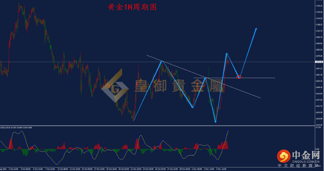 从黄金1H周期走势结构看,黄金自1617.0附近上涨,在涨至1674.0附近后遇阻下跌,最低再次跌至低点1617附近企稳,并快速拉升。从结构上看,黄金因为涨势过高,已经突破下跌压力线,并突破前期高点,表示价格向上打开上涨空间,后市看涨概率增加。结合1H周期MACD指标来看,双线处于零轴上方超买区域,表明多头走势较强,但双线有死叉迹象预示价格有回调,日内操作可考虑待价格回调至1660.0附近尝试布局多单。