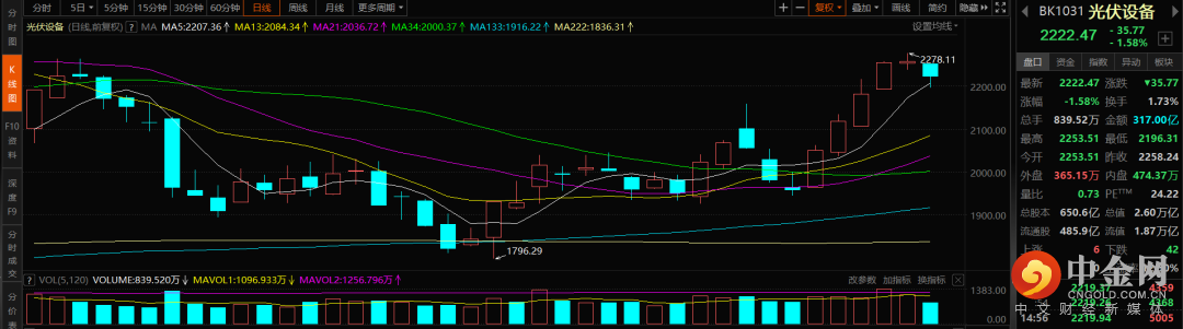 光伏设备:昨日风电设备领跌,但是随着政策利空传闻的辟谣以及铜价的下跌,今日已经开始修复。而这个时候光伏设备的领跌,更多的是对于连续上涨后的正常调整,短期还是处于上升通道中。不过像上文所说,赛道股上方的套牢盘压力比较大,需要时间去换空间,很难说一下子就突破难关,所以更适合逢低介入而不是追高。
