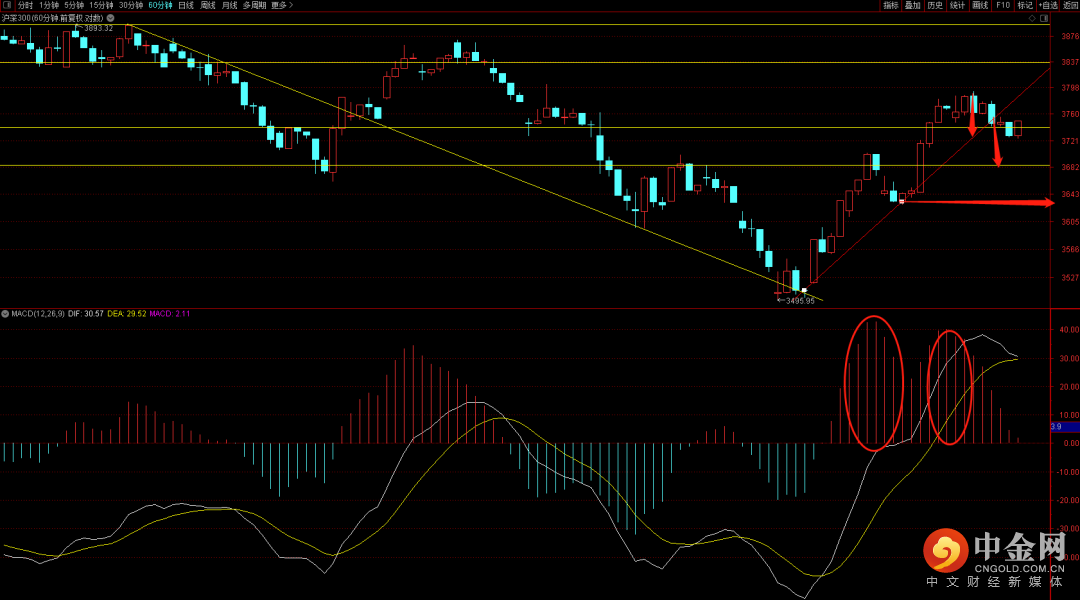沪深300短期跌破了六十分钟的上升趋势线,短期大概率会向下去试探3685点支撑,一旦跌破将有望回踩3630点,注意短期如果出现向上冲高要把握好高抛机会。