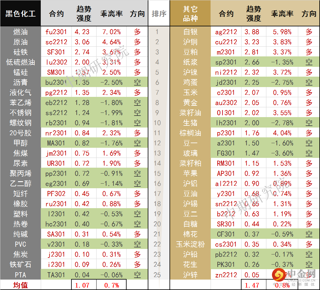 中期商品趋势榜 | 白银多头排名居首(1104)
