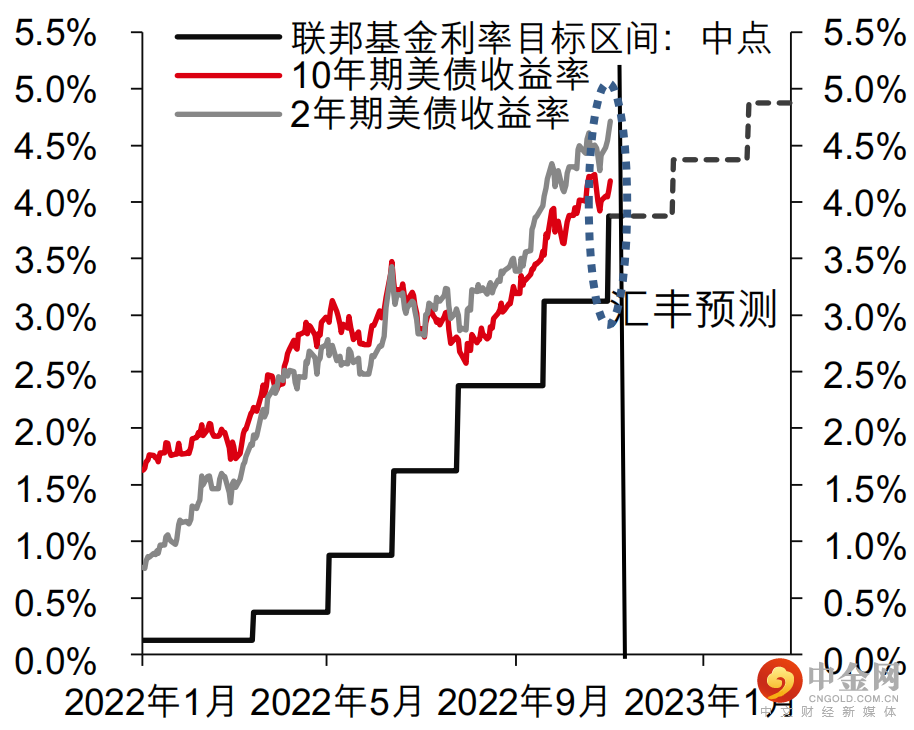 美联储在最新声明中表示央行愿意放缓加息步伐,但由于美联储主席杰罗姆·鲍威尔(Jerome Powell)在新闻发布会上总体保持鹰派立场,这项声明给市场带来的鸽派宽慰很快消失。他淡化了可能放缓加息步伐的重要性,认为更重要的问题是利率应该上升到什么程度,以及应该维持多长时间。他指出,最近的数据表明,峰值利率应该高于此前在9月20-21日联邦公开市场委员会(FOMC)会议上预测的水平。9月,联邦公开市场委员会对联邦基金利率的预测中值如下:2022年底为4.375%,2023年底为4.625%。因此,鲍威尔的言论表明,最终政策利率可能高于4.625%。这推动美债收益率上升。