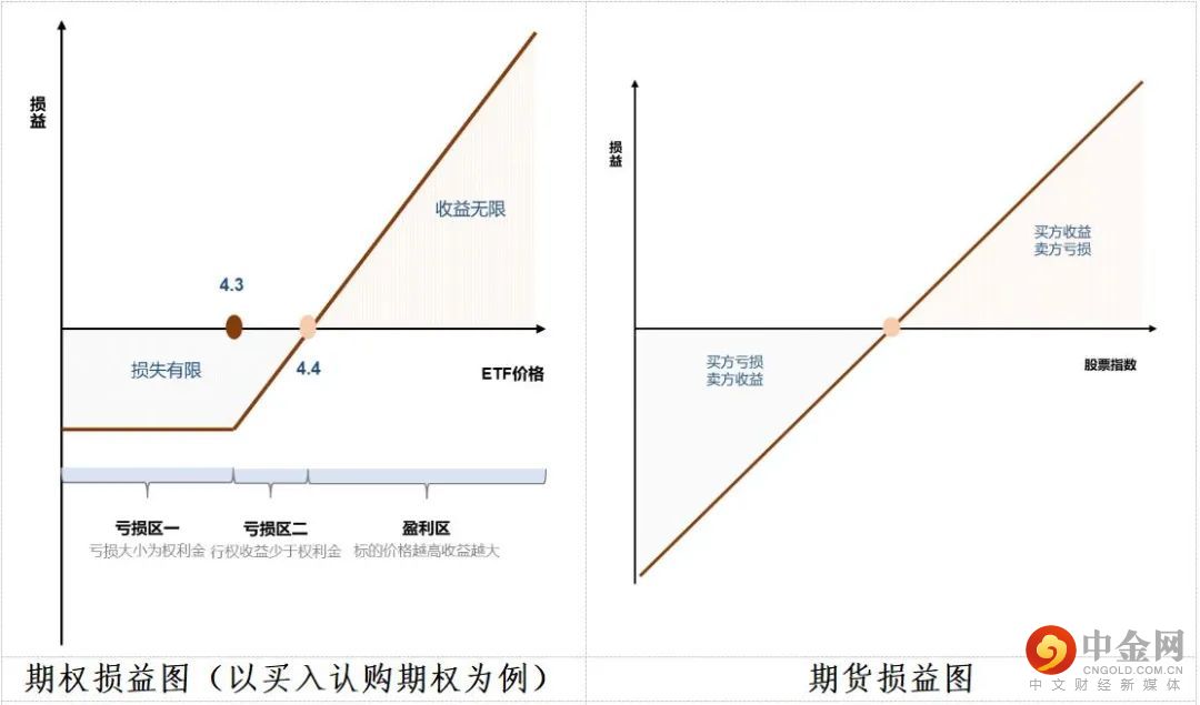 期货合约当事人双方负有对等的权利和义务,合约到期时,当事人必须按照约定的价格买入或卖出标的物(或进行现金结算)。而期权合约是非对称合约,期权买方有权利、无义务;期权卖方有义务、无权利(若期权买方选择行权,则期权卖方必须履行义务)。