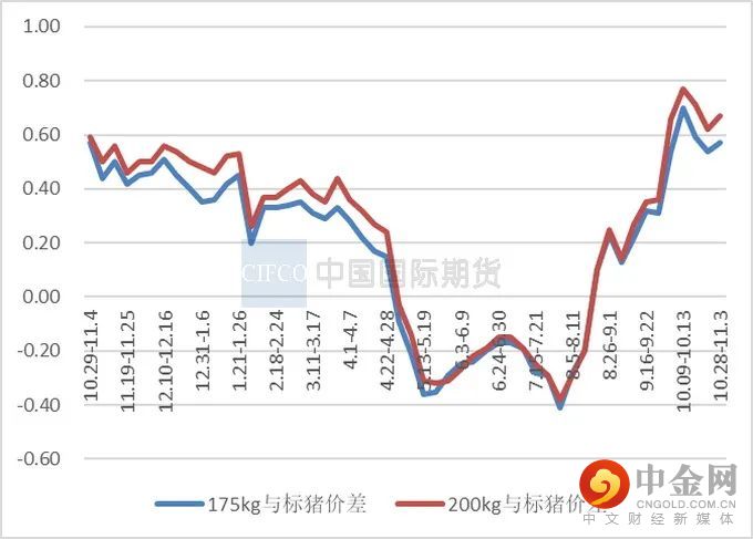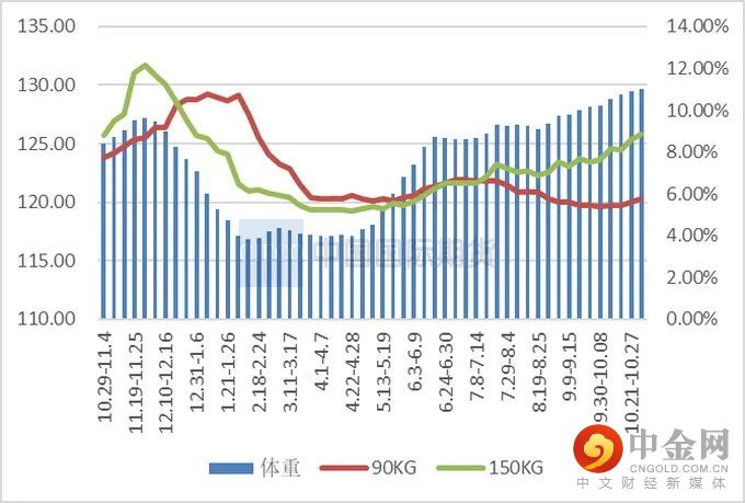 10月全国出栏平均体重126.06公斤,环比增加0.92%,同比增加1.30%。天气转凉后,市场对肥猪需求增加,且猪价快速拉升,肥标价差扩大,大猪利润增加明显,支撑养殖端压栏心态增强;同时猪价波动加大,部分养殖端为了兑现利润落袋为安,前期压栏的大猪出栏 。11月份即将开启腌腊旺季,市场大猪供应量或持续增加。