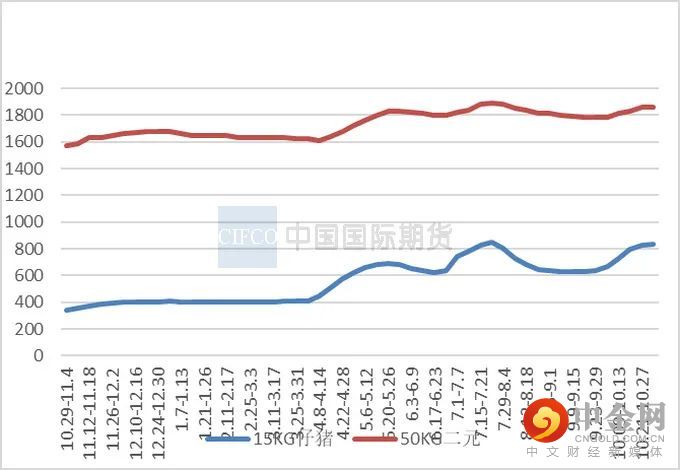 10月外三元仔猪出栏均价为755元/头,较9月增长19.65%,;二元母猪市场销售均价为1822元/头,较9月增长1.56%。仔猪价格上涨较明显,主要由于月内毛猪价格大幅度拉涨,带动仔猪报价同步上行,小部分散户短期内补栏积极性稍有增强,但市场整体成交仍显清淡,后期仔猪价格持续上涨动力或不足;相比仔猪涨幅明显,能繁母猪补栏相对不温不火,受毛猪价格持续上涨影响,10月二元母猪价格较9月微涨,但市场补栏情况无明显提升,实际成交量有限,企业多自留为主。