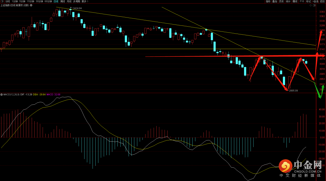 大盘缩量调整,短期已经出现顶分结构,注意观察三十分钟是否有一笔二卖反抽结构出现,如果出现注意逢高出局,短期有构筑头肩底形态的走势形态,关注后续下方2922到2936附近平台是否能够出现底分结构,一旦形成有望向上攀升至3300。