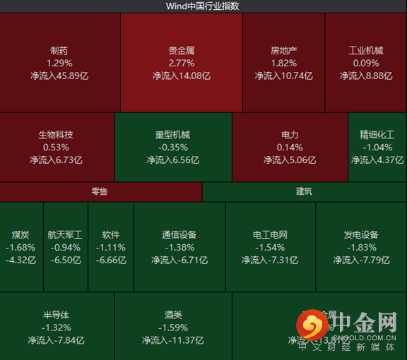行业板块方面,制药、贵金属、房地产、工业机械等板块资金呈现净流入局面,酒类、半导体继续呈现资金净流出局面。