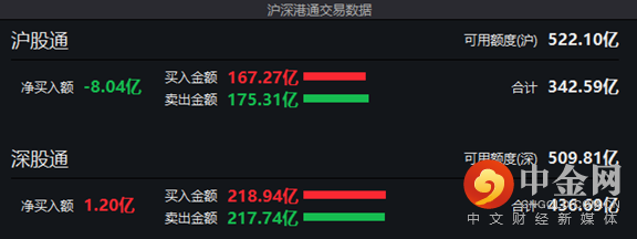 以每日额度余额口径,北向资金截至A股收盘净流入8亿元;以买卖成交额口径,北向资金净卖出7亿元。
