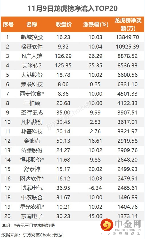 11月9日,上榜龙虎榜个股中,资金净流入最多的是新城控股,金额为1.38亿元。数据显示,该股日内涨停收盘,全天换手率2.69%。资金净流入居前的安信西安曲江池南路买入3246万元。
