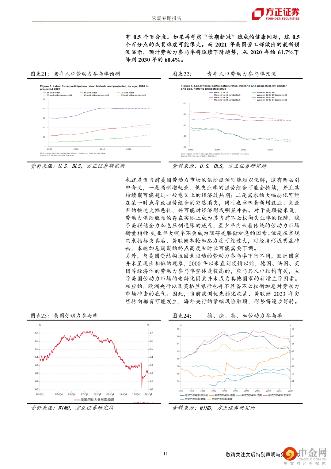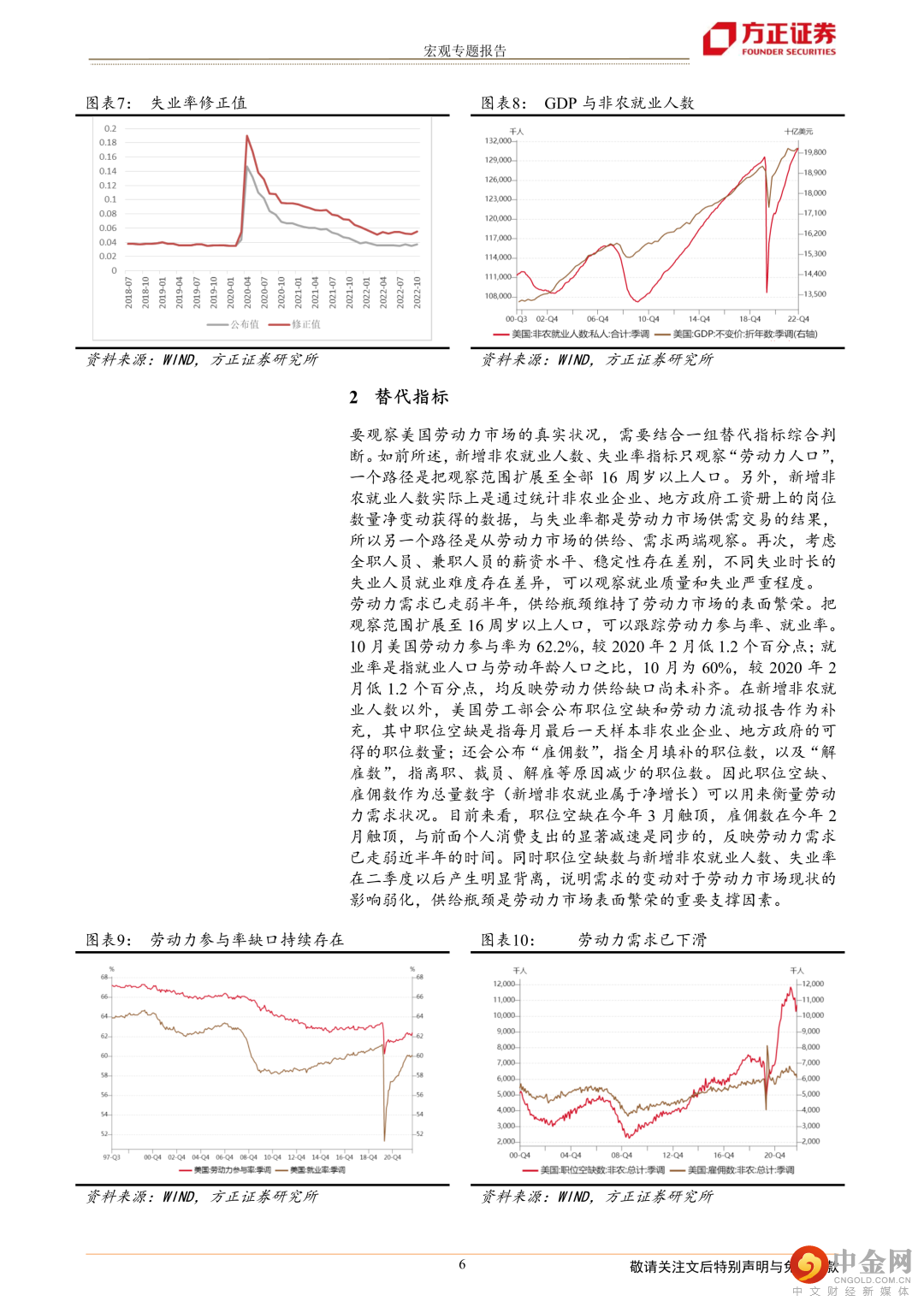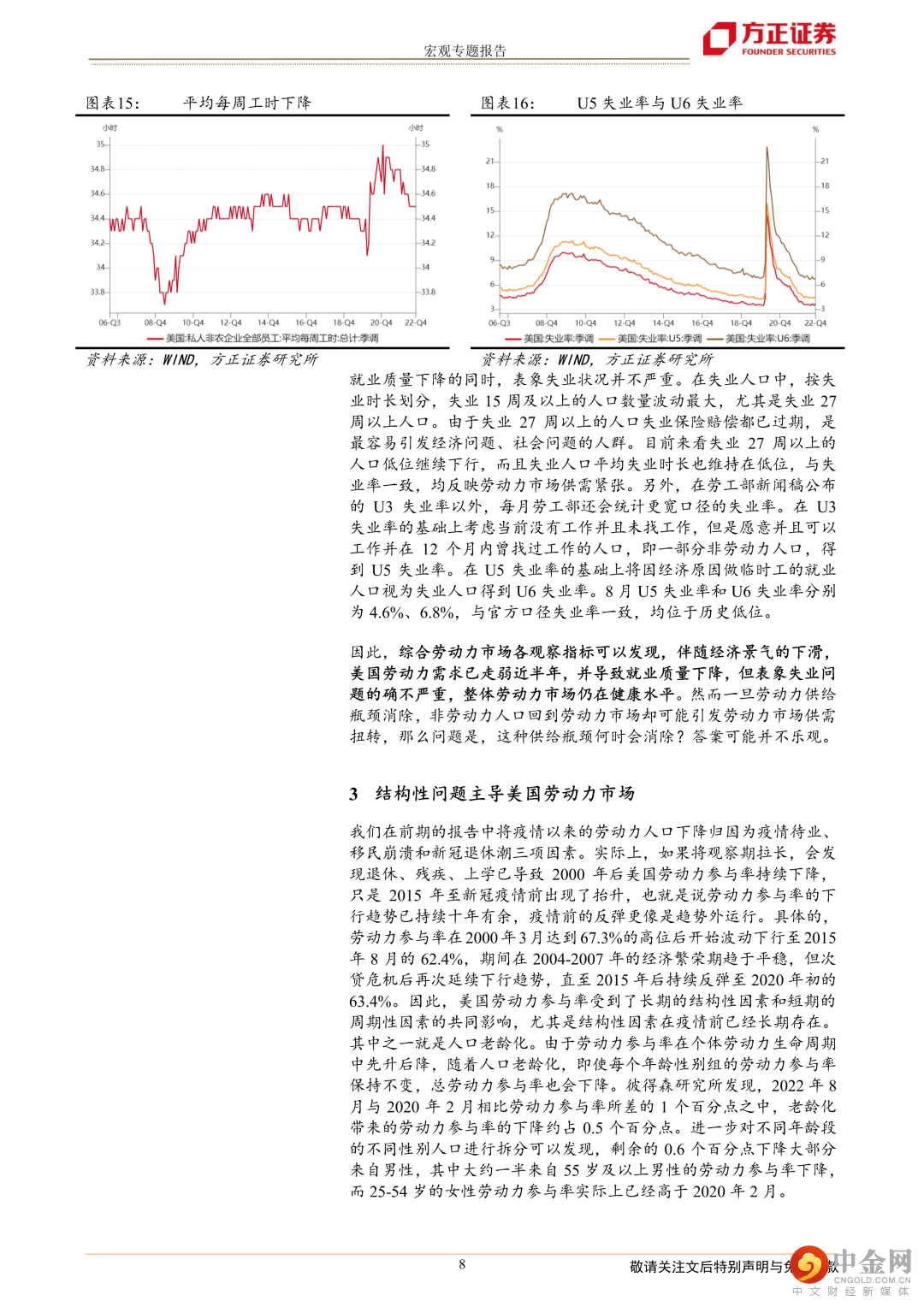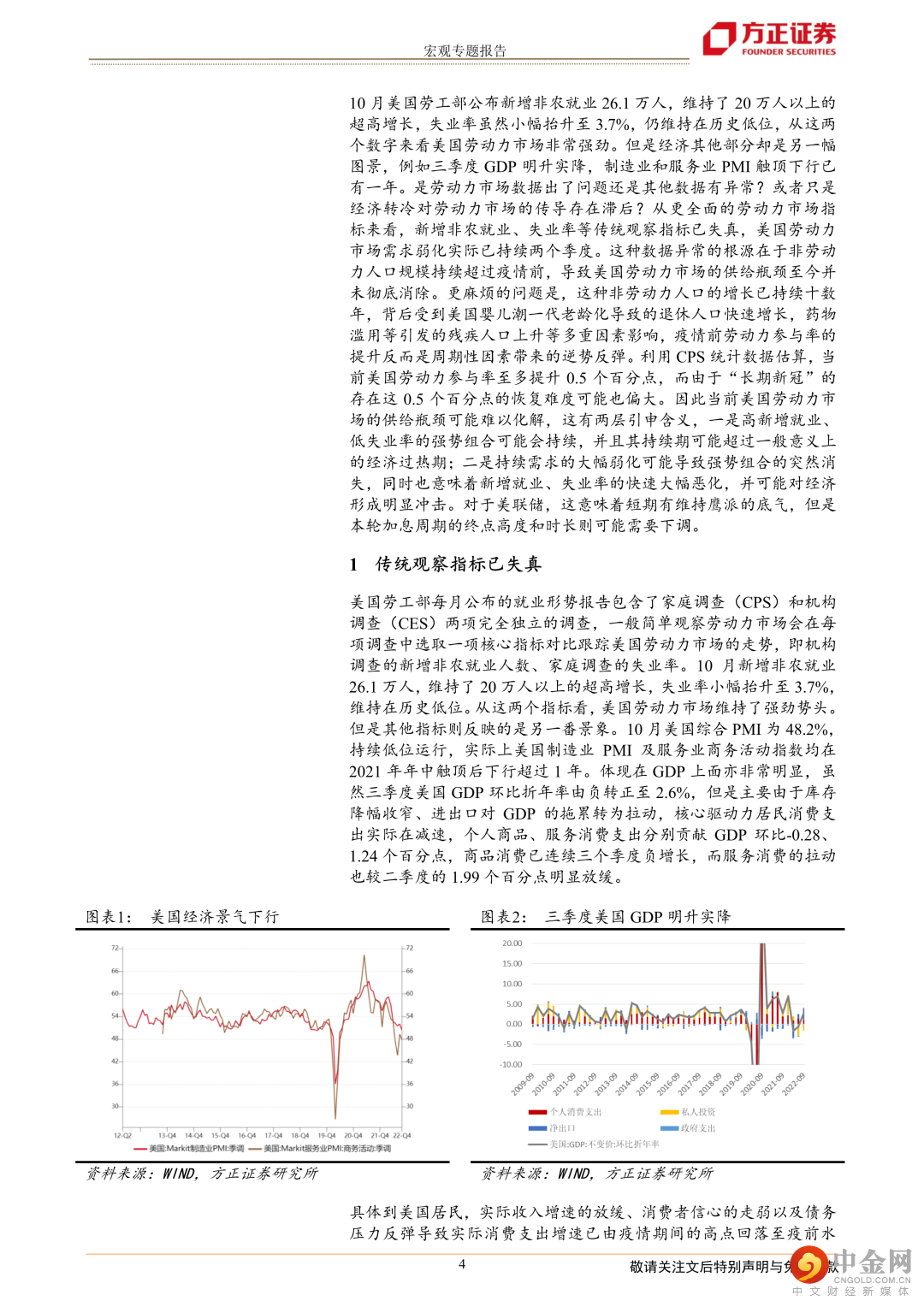 10月美国劳工部公布新增非农就业26.1万人,维持了20万人以上的超高增长,失业率虽然小幅抬升至3.7%,仍维持在历史低位,从这两个数字来看美国劳动力市场非常强劲。但是经济其他部分却是另一幅图景,例如三季度GDP明升实降,制造业和服务业PMI触顶下行已有一年。是劳动力市场数据出了问题还是其他数据有异常?或者只是经济转冷对劳动力市场的传导存在滞后?从更全面的劳动力市场指标来看,新增非农就业、失业率等传统观察指标已失真,美国劳动力市场需求弱化实际已持续两个季度。这种数据异常的根源在于非劳动力人口规模持续超过疫情前,导致美国劳动力市场的供给瓶颈至今并未彻底消除。更麻烦的问题是,这种非劳动力人口的增长已持续十数年,背后受到美国婴儿潮一代老龄化导致的退休人口快速增长,药物滥用等引发的残疾人口上升等多重因素影响,疫情前劳动力参与率的提升反而是周期性因素带来的逆势反弹。利用CPS统计数据估算,当前美国劳动力参与率至多提升0.5个百分点,而由于“长期新冠”的存在这0.5个百分点的恢复难度可能也偏大。因此当前美国劳动力市场的供给瓶颈可能难以化解,这有两层引申含义,一是高新增就业、低失业率的强势组合可能会持续,并且其持续期可能超过一般意义上的经济过热期;二是持续需求的大幅弱化可能导致强势组合的突然消失,同时也意味着新增就业、失业率的快速大幅恶化,并可能对经济形成明显冲击。对于美联储,这意味着短期有维持鹰派的底气,但是本轮加息周期的终点高度和时长则可能需要下调。