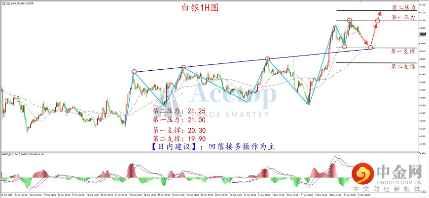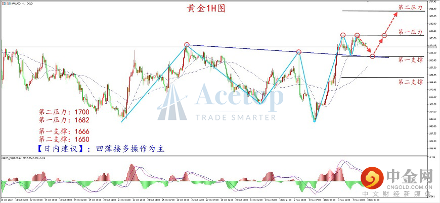 今日市场消息面相对较为清淡,本周重点关注周四即将公布的美国10月CPI数据,日内留意欧元区的9月零售销售数据,考虑到欧洲央行多次表态坚持大幅加息来应对通胀,若零售销售数据好于预期,则有望在打压美指的前提下,利多黄金。此外晚间举行的美国中期选举,将成为影响未来一段时间金价波动的主要因素之一,投资者需重点关注具体事件及数据对行情产生的影响,把握盘中交易机会。