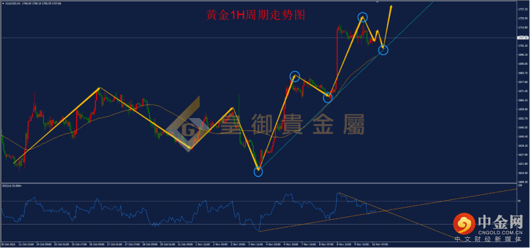 从黄金1小时周期图来看,黄金经历上周五以及本周二的连续两次大幅拉涨后,昨日选择高位震荡修整,向下最低触及1702一线,向上一度触及1721一线。目前从周线看,黄金已经突破自2070一线开启的下跌趋势线,月线级别本月收阳概率较高,叠加近期多头强势,预计未来行情仍将保持向上态势,建议以回踩做多为主,目前从1小时RSI来看,指标处于三角形整理之中,一旦指标向上突破,则将出现新的多头信号,今日可轻仓尝试多单。
