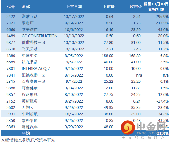 自2022年8月1日至2022年10月31日,共有19只新股于香港主板挂牌。其中腾讯音乐(1698 HK)以介绍形式上市,并没有募集资金。另外,由于汇德收购(7841 HK)并未有报价未能计算累积表现, 其余17只有募集资金新股截至2022年11月10日累积整体表现喜忧参半。当中8只累计上升,1只累计持平,其余8只累计报跌。受惠于香港股票市场于11月初从低谷回升及个别新股录得显著升幅,该17只新股平均录得23.4%正回报。