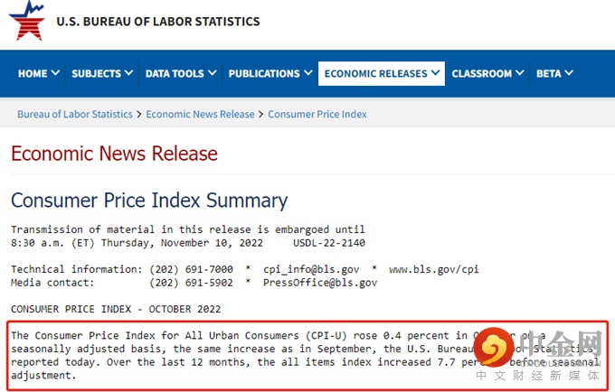 美国劳工统计局(BLS)于本交易日凌晨公布的美国10月通胀数据显示,10月通胀水平从9月的8.2%意外下降至7.7%,低于市场预期的8.0%,而更重要的是,核心通胀(即剔除能源及食品价格之后的通胀率)同样意外下降,从前值的6.6%下降至6.3%(预期6.5%)。