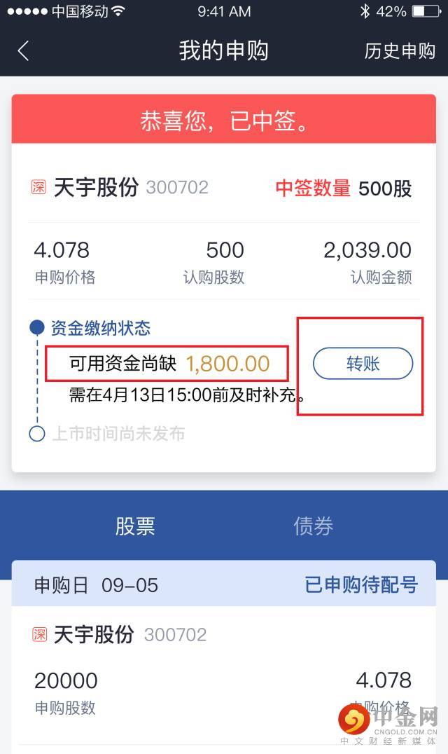 4、中签后自动检测可用资金,资金不够可直接转账。