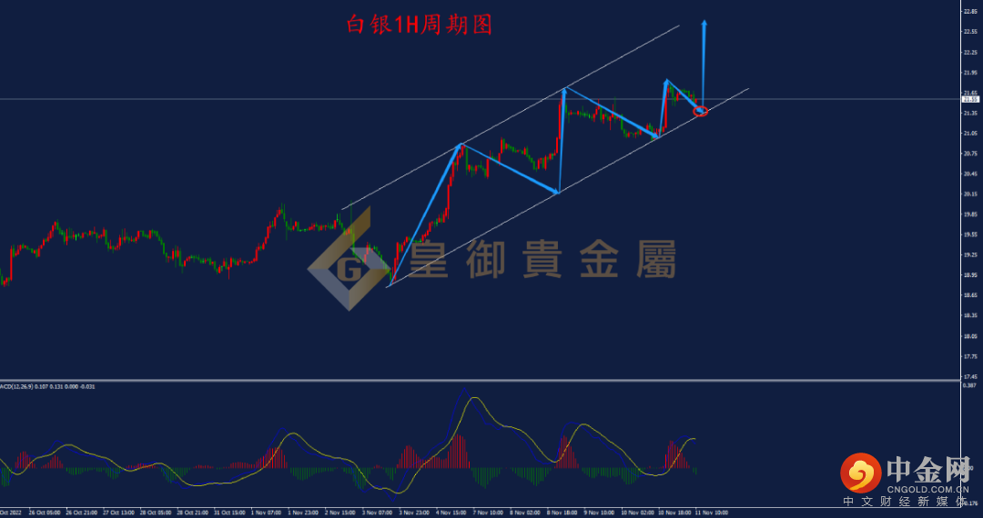 白银1小时周期,白银自底部18.83附近上涨以来,价格整体维持震荡上行。从形态上看,白银的高低点都在逐渐抬高,形成震荡上升通道,目前涨势出现放缓迹象,表明上涨动能有所减弱,但上升结构依旧运行良好,后续继续看涨概率较大。结合1H周期MACD指标来看, 双线处于零轴上方有死叉迹象,表明价格有回调需求。日内操作可考虑待价格回调至21.30附近尝试布局多单。