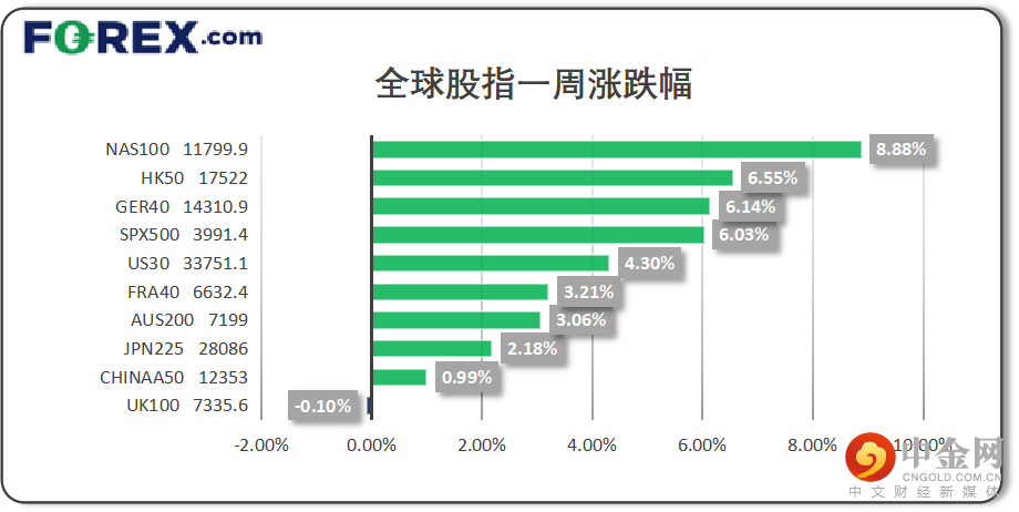 受政策优化的利好影响,中国相关资产上周延续反弹。沪指连续两周上涨,恒生指数周五+7.7%,恒生科技+10%,腾讯和阿里巴巴单日涨幅接近12%,纳斯达克金龙指数+6.56%。周末出炉的16项对于房地产市场的金融支持政策无疑意味着政策底的出现。近期内外部多重利好因素的集中涌现或许能在本周继续提振市场乐观情绪。