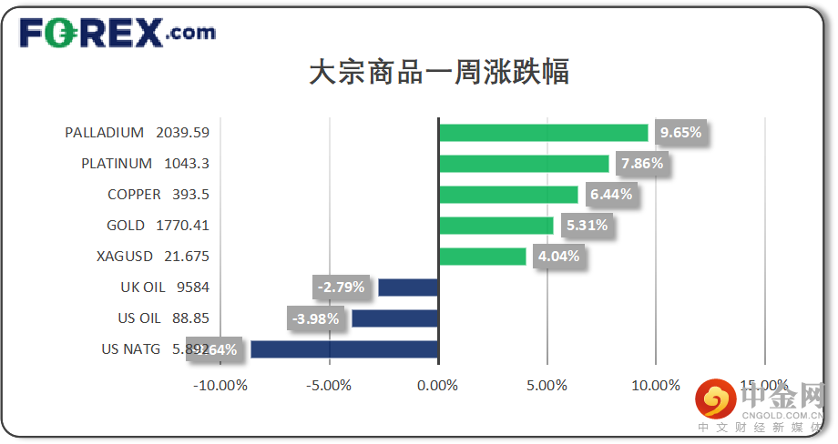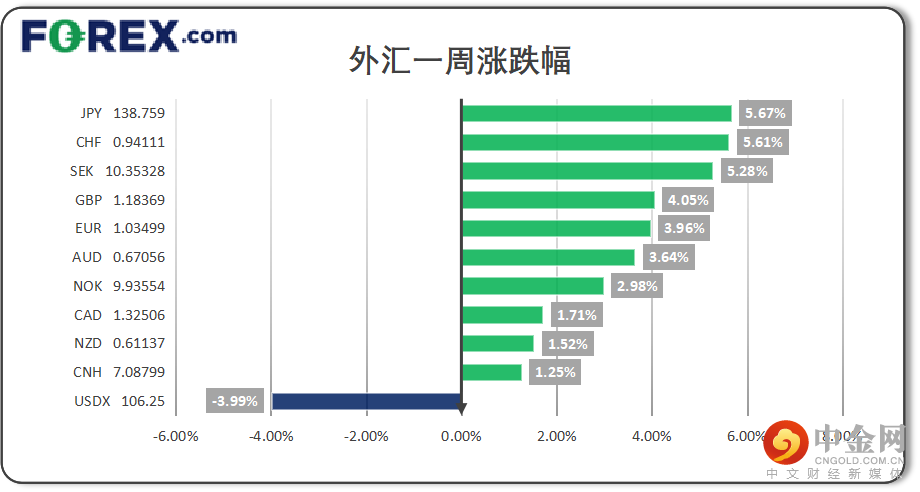 美元连续两天大幅回落,但市场尚未对美元形成一致的看空预期。日元和瑞郎(瑞士央行表示将抛售外汇)单周涨幅超5%。美国三大股指一周累计涨幅为4%-8%不等,是6月以来最好的单周表现。