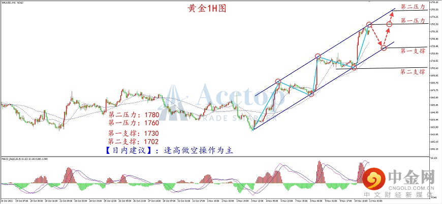 从黄金1H周期图来看,金价自1616的低点反弹以来走出高低点逐步抬高的看涨走势,虽然价格维持在上升通道内运行,但目前价格已经逼近1760的通道上轨压力,该位置可以作为较好的空单入场点,一旦受阻,向下回落1730的通道下轨支撑的概率增大。从MACD指标来看,双线在零轴上方死叉,空头动能柱逐步增长,表明空头即将发力,日内可以等待逢高布局空单机会。