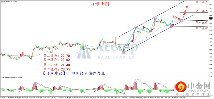 从白银1H周期图来看,白银自18.83低点上涨以来,走势高低点逐步抬高的看涨形态,且价格维持在上升通道内运行,下方关注21.40的通道下轨支撑,该位置可以作为今日较好的多单入场点,企稳后看向22.00整数压力的概率增大,一旦上破,有望进一步看涨至22.70的通道上轨压力附近。从MACD指标来看,双线在零轴上方死叉,表明行情存在回调的需要,日内可以等待回落布局多单机会。