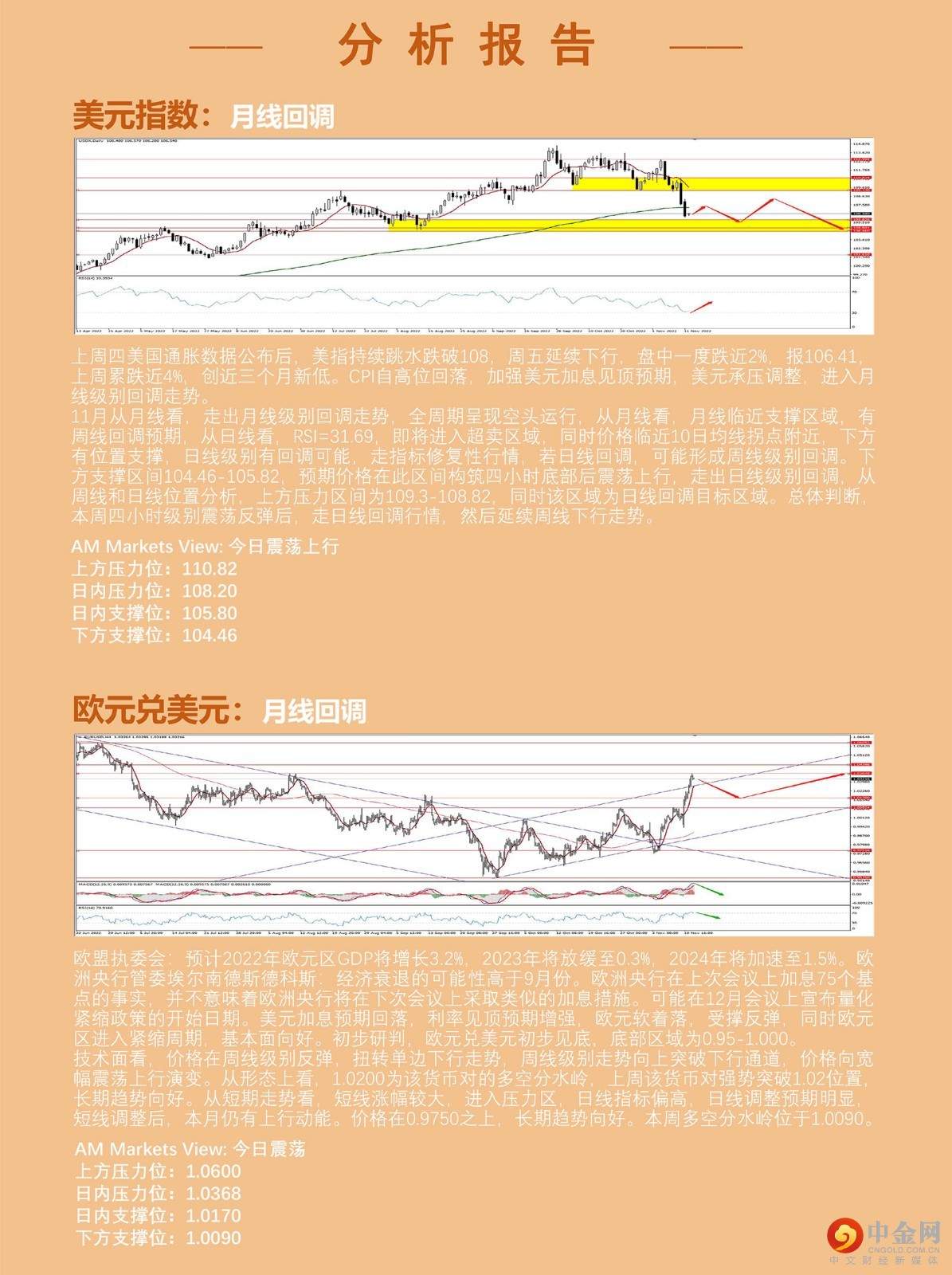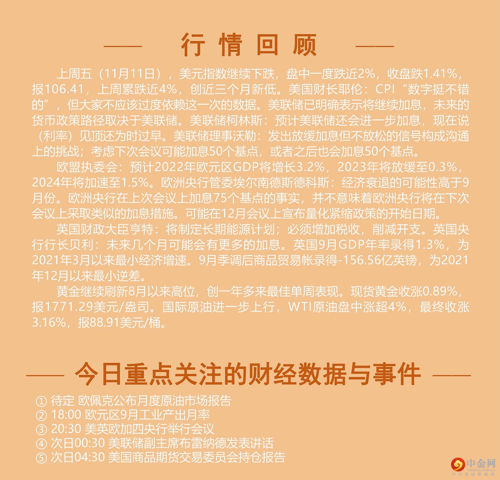 上周五(11月11日),美元指数继续下跌,盘中一度跌近2%,收盘跌1.41%,报106.41,上周累跌近4%,创近三个月新低。美国财长耶伦:CPI“数字挺不错的”,但大家不应该过度依赖这一次的数据。美联储已明确表示将继续加息,未来的货币政策路径取决于美联储。美联储柯林斯:预计美联储还会进一步加息,现在说(利率)见顶还为时过早。美联储理事沃勒:发出放缓加息但不放松的信号构成沟通上的挑战;考虑下次会议可能加息50个基点,或者之后也会加息50个基点。 欧盟执委会:预计2022年欧元区GDP将增长3.2%,2023年将放缓至0.3%,2024年将加速至1.5%。欧洲央行管委埃尔南德斯德科斯:经济衰退的可能性高于9月份。欧洲央行在上次会议上加息75个基点的事实,并不意味着欧洲央行将在下次会议上采取类似的加息措施。可能在12月会议上宣布量化紧缩政策的开始日期。 英国财政大臣亨特:将制定长期能源计划;必须增加税收,削减开支。英国央行行长贝利:未来几个月可能会有更多的加息。英国9月GDP年率录得1.3%,为2021年3月以来最小经济增速。9月季调后商品贸易帐录得-156.56亿英镑,为2021年12月