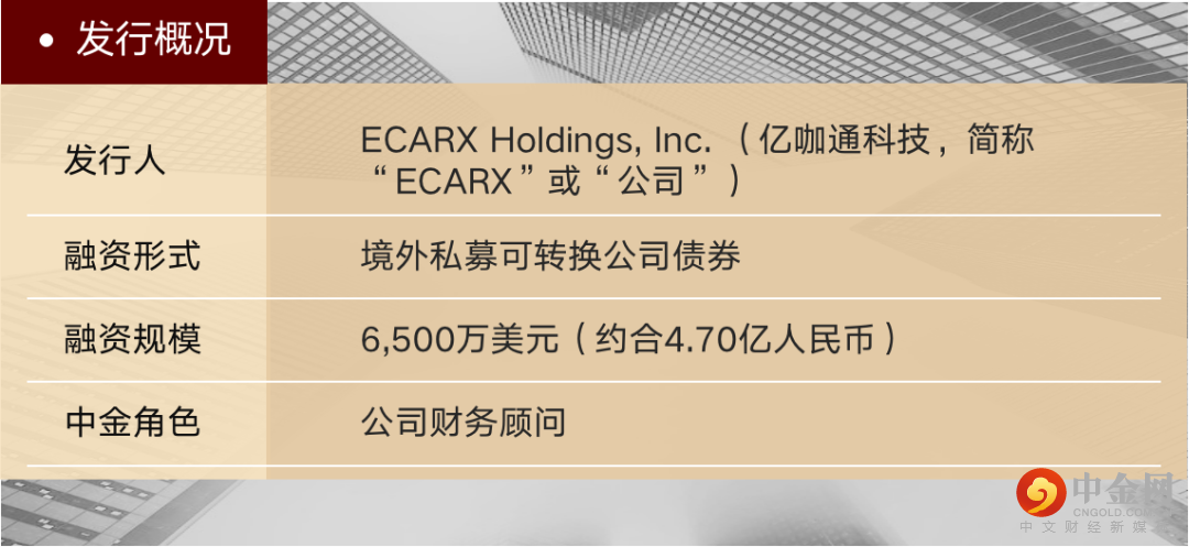ECARX Holdings, Inc. (以下称“ECARX”、“亿咖通科技”或“公司”)已完成境外可转债私募融资项目,融资规模为6,500万美元(约合4.70亿人民币),中金公司在此交易中担任亿咖通科技的财务顾问。