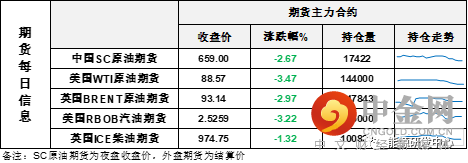 【1】WTI主力原油期货收跌3.09美元,跌幅3.47%,报88.57美元/桶;布伦特主力原油期货收跌2.85美元,跌幅2.97%,报93.14美元/桶;INE原油期货收跌2.67%,报659元。