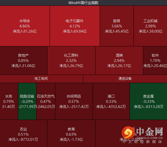行业板块方面,半导体、电子元器件、券商、工业机械等内容资金净流入排名靠前,海运、教育、农业等内容资金净流出排名居前。