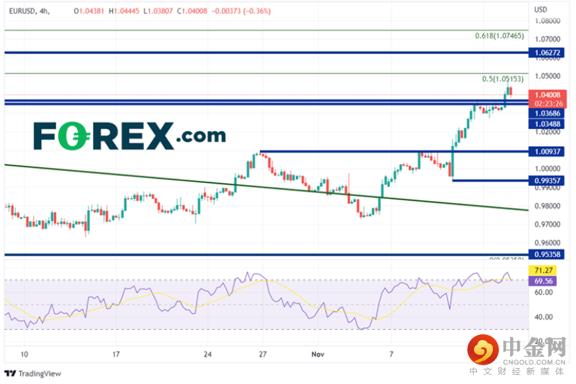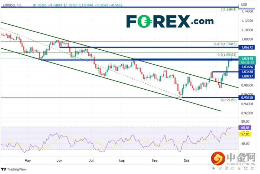 欧元/美元自2月达到年初至今高点1.1495后,沿着下行通道稳步下跌。9月28日,该货币对下探至0.9536,测试下行通道下轨。随后该货币对在10月25日反弹,冲破通道上轨的0.9975附近区域。欧元/美元击穿1.0350/70附近的强势阻力位,日内最高点上探至1.0482。