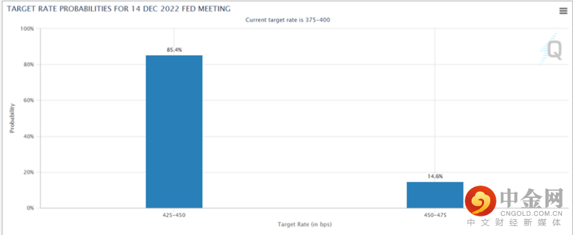 上周公布的美国10月CPI为7.7%,低于预期的8.0%。 本 周二上午公布了美国另一重要通胀数据PPI的10月表现。此前预期10月PPI将达到8.3%,但实际数值降至8%,远低于前值的8.4%。10月核心PPI为6.7%,低于同为7.2%的前值和预期值。11月的FOMC会议后,美联储讨论放缓联邦基金利率提高幅度的可能性。周一,美联储副主席布雷纳德表示:“可能很快放缓加息步伐。”但仅靠前两周的低通胀数据,就能让美联储把加息幅度从75个基点降至50个基点吗?根据芝商所“FedWatch”工具,市场认为12月14日议息会议加息50个基点的可能性为85.4%,而在上周CPI数据公布前,市场认为加息50个基点和75个基点的可能性大致五五分。
