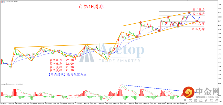 从白银1H周期图看,白银在低位构建了一个大型箱体形态后突破确立了多头趋势,目前行情延续多头趋势运行,但是行情已经到了相对高位。昨日价格在22.11附近承压回落,多头动能减弱,空头开始发力,行情短线进入下了震荡调整节奏。目前走势沿着上涨通道缓缓上行,上轨形成短线压力作用。结合MACD指标来看,快慢线多次再0轴上方形成死叉信号,快慢线高点不断降低,同时对应上涨浪高点不断抬高,每段上涨段对应红色动能柱子面积不段变小,出现顶部背离信号,表明多头已经衰弱,调整行情随时开启。策略上投资者尝试压力位布局空单思路。