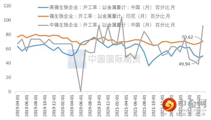 当前,国内镍铁产量仅为印尼镍铁产量的1/3,印尼镍铁已经逐步成为我国最主要的不锈钢原料来源。SMM数据显示,2022年10月,全国镍生铁产量为3.572万镍吨,印尼则产量达到10.57万镍吨。开工率方面,国内10月全国镍生铁开工率50.55,位于中低位,比9月47.49有所上升,但仍低于本年58.97的高点。而印尼的镍铁开工率依旧在70以上。