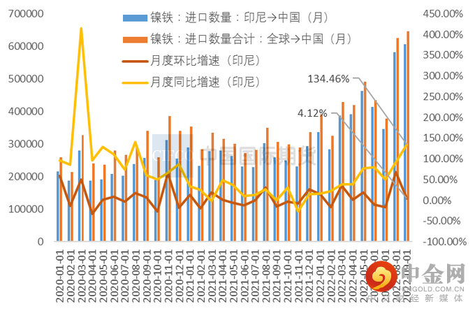 此外,我国对印尼镍铁量进口量持续高位,较去年同期增加了1.34倍。2022年9月中国镍铁进口量64.59万吨,同比增110.72%,仍在超高速区间。其中,自印尼进口镍铁量60.68万吨,月度环比增加4.12%,同比增加134.46%。8月以来,我国自印尼镍铁进口量接近60万吨高位。
