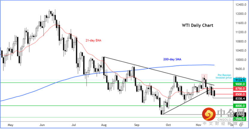 中国市场方面,如果实施新的新冠限制措施将挫伤市场需求,油价未来几周可能进一步下跌。WTI面临跌至80美元的风险,特别是目前价格已跌破三角形态向下延伸: