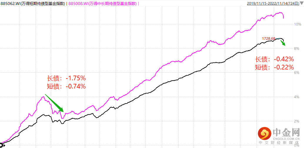 上图展示了过去3年间,长债基金(粉色)和短债基金(黑色)的指数走势。本次的调整放在长期视角下看非常正常。