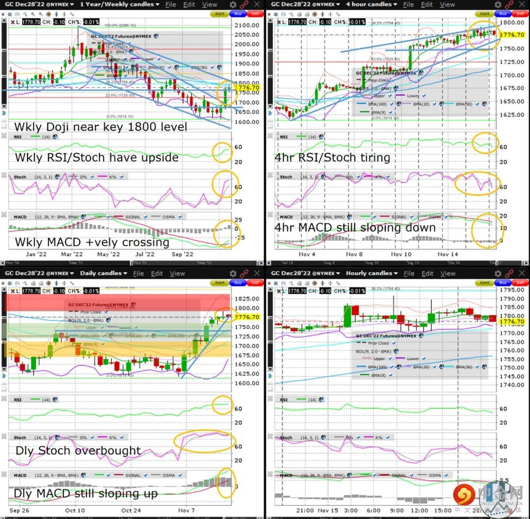 黄金期货(GC)连续第二日在关键整数心理水平1800美元和3月至10月下跌的38.2%斐波那契回撤线下方盘整。