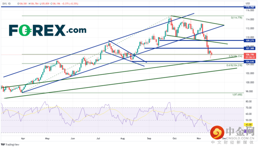 总的来说,美元并没有特别受益于超出预期的零售销售数据。持续遭受抛压的美元指数当天小幅下跌至3月31日低点到9月28日高点区间的50%回撤位106.23附近。如果继续走低,支撑位在2021年5月(绿色)的上行倾斜趋势线105.00附近,然后水平支撑位在8月11日以来的低点104.65附近。在此下方,价格可能会跌至上述区间的61.8%斐波那契回撤位104.22。但如果美元指数反弹,阻力位于前低107.59附近。在此上方,价格会受阻于近期形成的短期通道下沿109.02附近,然后是水平阻力位109.27。