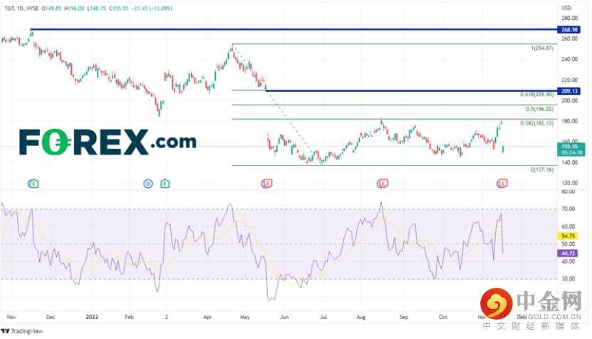塔吉特的股价从2021年11月15日创下历史新高268.98后大幅下跌。该股在5月17日公布第一季度财报后从215.28下跌至163.07。股价在6月30日创下年初至今的低点137.26,然后反弹至4月21日高点至6月30日低点区间的38.2%斐波那契回撤位182.13附近。但在今天公布了欠佳的业绩之后,该股从昨天收盘价178.98跌至149.85!支撑位在6月30日低点137.16,而阻力位在跳空缺口176.90。