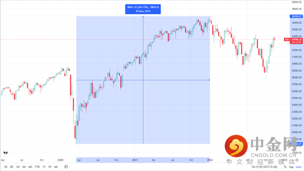 以道指为例,该股指从2020年3月23日的18,631点一路上涨至2022年1月3日的36,938点,在22个月的时间里暴涨101.77%。而侧重科技股的纳斯达克指数和涵盖面更广的标普500指数也出现了一样惊人的涨幅。