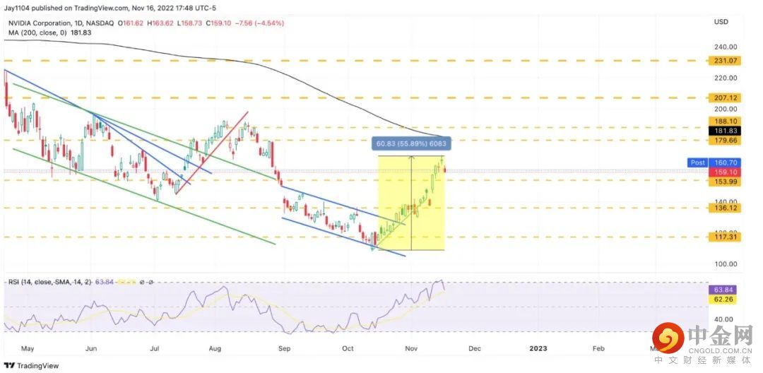 英伟达的股票在盘后交易时段小幅上涨,不过该公司的股价已经从10月低点处上涨了50%。11月18日到期的英伟达期权的隐含波动率在今天为140%.