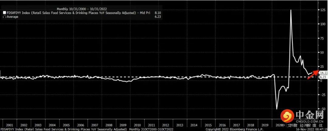 从今天公布的零售销售数据中你不会观察到通货膨胀正在降温的迹象。我不会深入解读数据,不过公布的数据好于市场预期。我发现的一项有趣的数据是食品和饮料的数据:也就是外出就餐的数据,按年同比增长了14.1%。有趣的点在于,该项数据稳步下降,不过在近期再次转头向上。这就是通货膨胀(的粘性)。