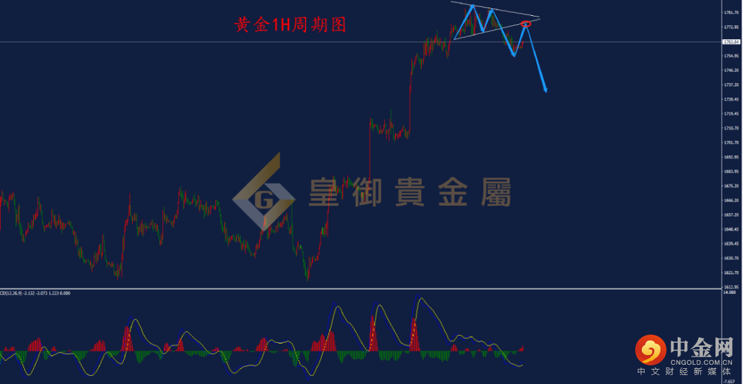 从黄金1H周期看,黄金在涨至1785.9附近遇阻后,价格维持在高位反复震荡,形成震荡三角整理形态。从结构上看,黄金已跌破三角形态的下轨支撑,往下打开下跌空间,预示高位震荡整理已经结束,行情启动新的下跌节奏,后市看跌概率增加。结合1H周期MACD指标来看,双线处于零轴下方区域,但双线有金叉迹象,预示价格有反弹需求,日内操作可考虑待价格反弹至1774.0附近尝试布局空单。